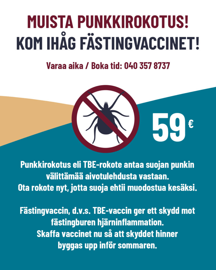 Punkkirokotus eli TBE-rokote antaa suojan punkin välittämäa aivotulehdusta vastaan. Ota rokote nyt, jotta suoja ehtii muodostua kesäksi.